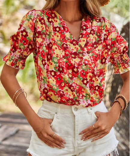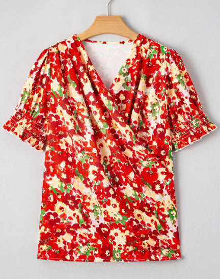 Red Floral Bubble Sleeve Pleated V Neck Wrap Blouse
